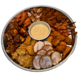 Een partypan met hapjes van malse kip en lekkere Jamballa saus.
